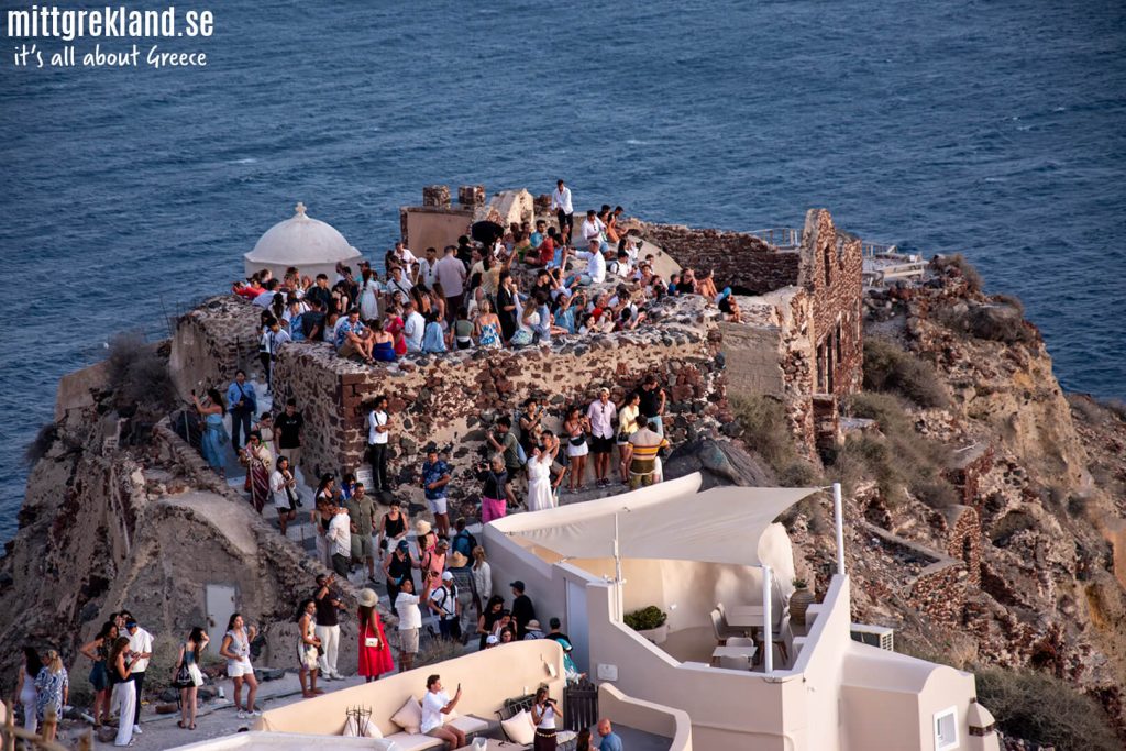 Längst ut på udden i Oia finns ruinerna av det venetianska kastellet från 1200-talet som erbjuder en utmärkt plats att beskåda solnedgången på, men det kommer du inte vara ensam om att vilja göra. Långt innan den blodröda solen sjunker i havet samlas folk på kaféer och tavernor och de öppna platser som finns för att få njuta av naturens skådespel.