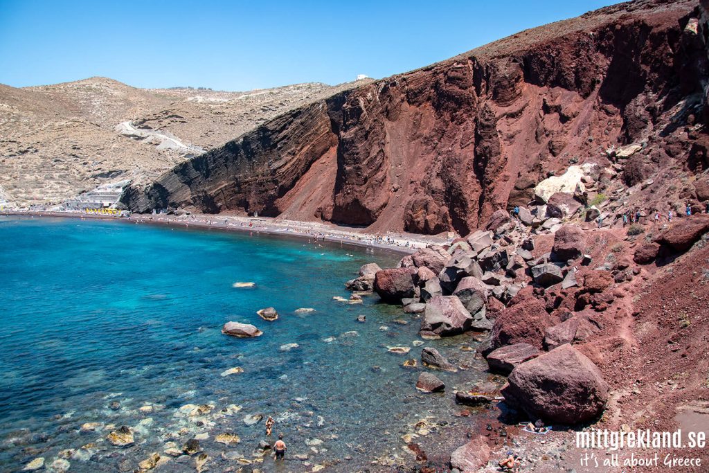 The Red Beach är kanske den mest kända och uppseendeväckande stranden. Den ligger i närheten av byn Akrotiri vid kanten av rödfärgade klippor. Stranden är rätt liten och blir snabbt full av sollapande människor och de som vill snorkla i det klara vattnet och beskåda de färggranna klippformationerna.