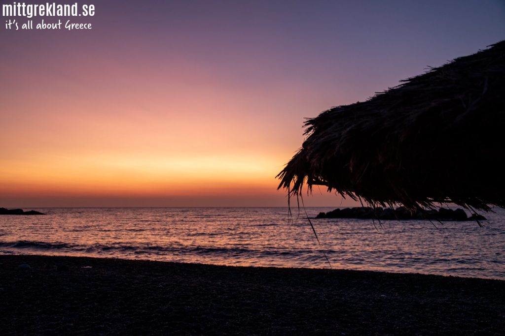 Natten är mörk när jag anländer till Santorini men de klassiska dofterna av soltorkad växtlighet och salt hav avslöjar direkt att jag har landat på en grekisk ö. Ljuden av cikador och diskussioner på grekisk får mig att känna mig hemma. En kort transfer tar mig till hotellet i Kamari, en av Santorinis klassiska semesterorter intill den svarta lavasandstranden och klippan Mesa Vounos. Kamari är inte mitt fokus på denna resa utan är enbart utgångsläget för att uppleva andra delar av Santorini.