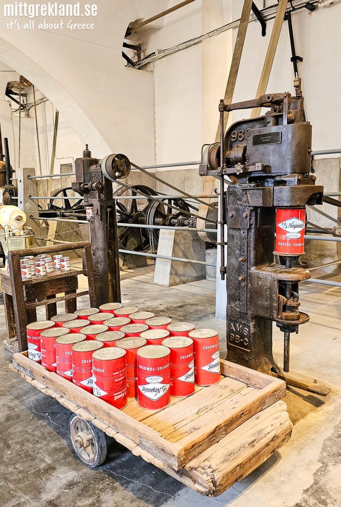 Här får du lära dig mer om de traditionella odlingsmetoderna som användes på Santorini, hur tomaterna bearbetades, om fabrikens arbetare, utvecklingen som kom med maskinerna samt hela produktionen till färdig produkt, dvs tomatpuré och konserverade tomater.